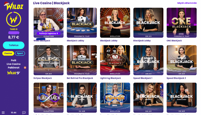 Suurin osa Wildzin blackjack-peleistä löytyy live-kasinolta, jossa tätä korttipelien kuningatarta voi pelata Evolutionin, Pragmaticin ja OnAir Entertainmentin versioina.