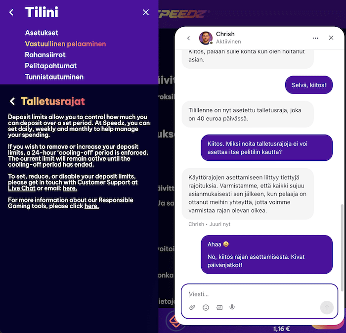 Speedzin asiakaspalvelu on auki 24/7. Ikävä kyllä vastassa on ensin botti, joka ei ainakaan meidän kokemustemme perusteella ole minkäänlaiseksi avuksi. Onneksi botti hälyttää ihmistukihenkilön apuun melko matalalla kynnyksellä.